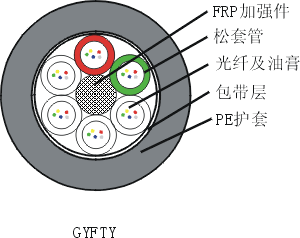 GYFTY光缆的结构是将单模或多模光纤套入由高模量的塑料做成的松套管中,套管内填充阻水化合物。 缆芯的中心是一根非金属加强芯(FRP),对于某些芯数的光缆来说,非金属加强芯外还需挤上一层聚乙烯,松套管(和填充绳)围绕中心加强芯绞合成紧凑和圆形的缆芯,缆芯内的缝隙充以阻水填充物,最后挤制聚乙烯护套成缆。